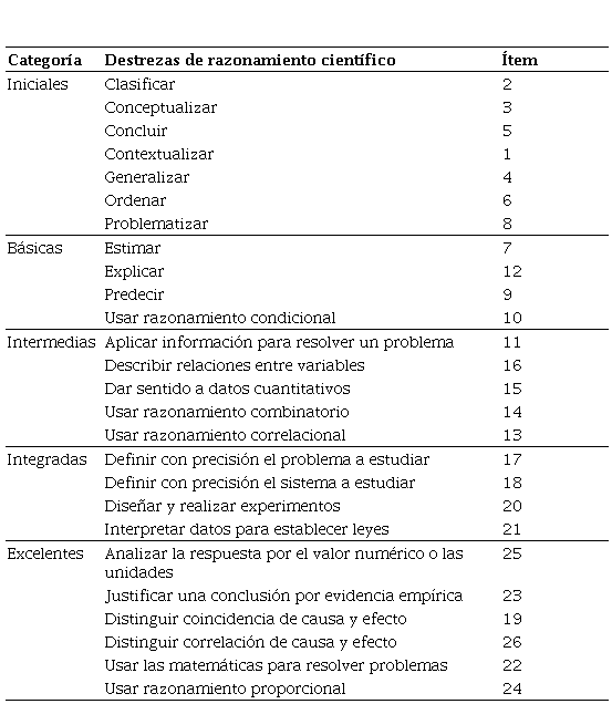 La versión final del cuestionario contiene 26 ítems de opción múltiple con cinco respuestas posibles. Sólo existe una respuesta correcta. Cada uno de ellos evalúa una habilidad de razonamiento. Estas habilidades se categorizan a su vez en cinco niveles: elementales, básicas, intermedias, integradas y excelentes (Hanson, 2016). En la Tabla 1 se muestran las habilidades o destrezas de razonamiento científico que pertenecen a cada una de estas cinco categorías y se indica el ítem que corresponde a dicha destreza. En el Anexo 1 se muestran algunos ítems del cuestionario.