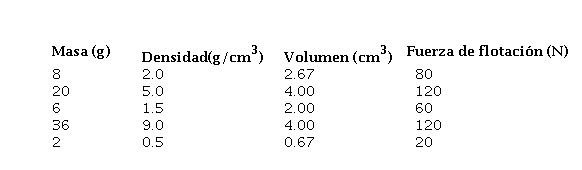 Ítem 14.-Los siguientes datos fueron recogidos de varios objetos colocados en un recipiente con agua.