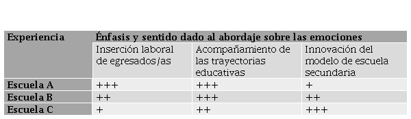 Las tres escuelas relevadas comparten la característica de presentar improntas institucionales distintivas, intervenir sobre colectivos de jóvenes en situación de vulnerabilidad e implementar propuestas de trabajo con aspectos socioemocionales. No obstante, al analizar los objetivos, fundamentos y estrategias de implementación, se evidencian diferentes sentidos construidos sobre el abordaje de las emociones.
