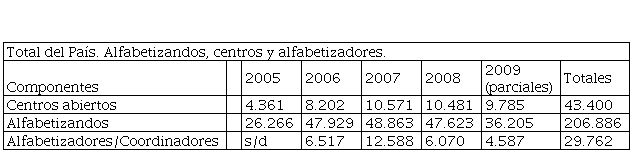 Un año más tarde, en 2009, se alfabetizaron a 59.327 personas, según los datos de gestión educativa (Gobierno de Argentina-Economía-Hacienda, 2009) y se había logrado la “reincorporación de Jóvenes y Adultos a la Educación Formal” a un total de 654.771 personas. En otro informe del mismo año se estimulaba la participación comunitaria intensificando el vínculo con ONGS, entidades de la sociedad civil, universidades, iglesias, entidades gremiales conveniantes (Argentina-Jefatura de Gabinete de Ministros, Informe a la Honorable Cámara de Senadores de la Nación, 2009a, pp. 246-248). También se resumían los principales alcances en materia de alfabetización, en este caso a partir de la elaboración de la respuesta por el Ministerio de Educación:
