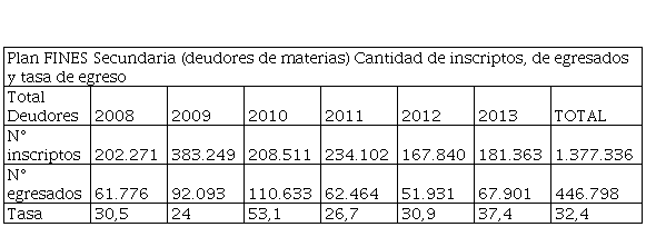 En otro informe, se referenciaba que desde 2008 a 2011 se habían inscripto en el Plan Fines 1.061.304 personas y habían egresado (titulado) 362.129; 11.045 espacios funcionaban como sedes y tenían 86.419 tutores (Argentina-Jefatura de Gabinete de Ministros, Informe a la Honorable Cámara de Diputados de la Nación, 2012, p. 510). Tal como se aclaraba en la respuesta del Ministerio de Educación se trataba de datos parciales al 30/04/2012. Considerando que en todo el país existían para el mismo año un total de 34.411 unidades educativas para los niveles primario y secundario de la modalidad común, el dato resulta impactante. Más aún si se considera que, para toda la modalidad de jóvenes y adultos, EDJA, en todo el país, se disponía de apenas 4.756 unidades educativas para primaria y secundaria.