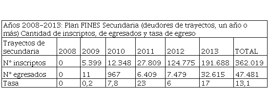 A lo largo de 2013 se alcanzó a 54.765 adultos alfabetizados y se reincorporaron 451.277 personas al sistema formal (Economía-Hacienda, 2013). En lo que refería a la evolución de inscriptos en Fines, se registraba un incremento en la línea Fines 1 que alcanzaba a un total de 385.022 alumnos mientras que Fines 2 Secundaria registraba un total de 47.481 concentrando más de la mitad en la provincia de Buenos Aires (25.068) y Fines 2 Primaria, 18.799. Por lo menos, así surge de los datos de Gestión Educativa del apartado Ministerio de Educación en las Cuentas de Inversión.