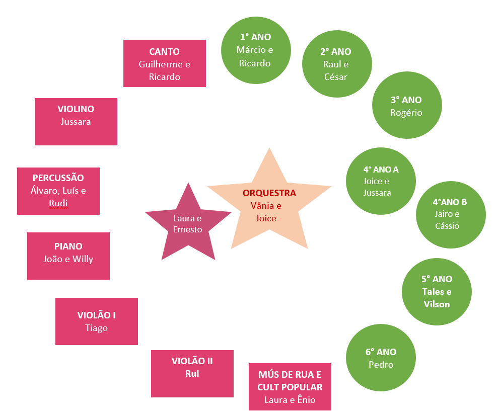 Propositalmente, procuramos atrair, juntamente com as crianças e adolescentes matriculados na en, as suas famílias, professoras/es de todas as áreas, técnicas/os e administradoras/es, guardas-noturnos e limpadoras – a comunidade escolar como um todo. Trago como ilustração o organograma de 2017, ano em que o música estava com as atividades assim estruturadas na en: