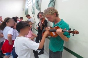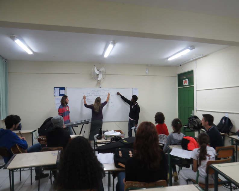 Muito embora não houvesse música no currículo da nossa e-n, aos poucos a ambiência musical em torno da equipe do música foi crescendo e transformando a paisagem sonora de seus tempos-espaços: inicialmente, através de oficinas extraclasse de instrumentos musicais e canto, que se realizavam após o horário das aulas curriculares da manhã e da tarde, às 17h30, para que todas as pessoas interessadas pudessem participar; em seguida, já no segundo semestre do mesmo ano, 2014, conseguimos inserir música no currículo do 4º e do 5º ano do Ensino Fundamental. No ano seguinte, inserimos a música também no 3º e 6º anos, com um bolsista música em cada turma, sempre tornandoas também campo de estágio.