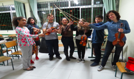 Hoje, na reunião com o pmúsica, apontei os prejuízos da homogeneização sistêmica mercadológica, associando a homogeneização que a escola reproduz, desde a exigência de que crianças e adolescentes tenham a mesma idade em cada turma. Quando falei “vocês são, ou melhor, nós somos um grupo rico, também por sermos pessoas de idades diferentes e de distintas fases do curso, convivendo, um deles comentou: “nossa, é verdade!... sempre tem a galera de formandos interagindo com os calouros6. Eu não lembro, profe, de pertencer a um coletivo assim... com tantas diferenças... só que elas são boas. Foi lindo ver a Verinha, de seis anos, ensinando o Marcos, que tem 16, a segurar o arco do violino”. Ele sorriu e foi fazer anotações em seu caderno (Diário de campo, 22.03.15).