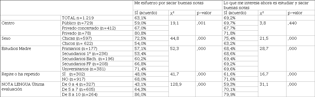 Como vemos en la tabla 1, la identificación con el esfuerzo y con el interés por estudiar y sacar buenas notas se relaciona significativamente, y por grado de importancia, con el rendimiento académico (alumnado con mejores notas); con el origen social (el alumnado con madres de estudios medios y superiores); con el género (las alumnas más que los alumnos) con la trayectoria académica (el alumnado que ha suspendido); y parcialmente (sólo la identificación con el esfuerzo) con el tipo de centro (a favor de los centros privados y privados concertados).