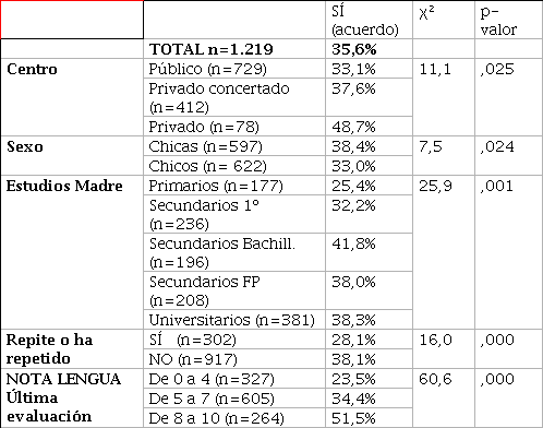 En este caso, como observamos en la tabla 2, son los factores académicos los que más determinan la variabilidad de las respuestas: el alumnado con mejores notas y que no ha repetido se asocia mayormente con la opinión de que les molesta tener compañeros/as que “pasan de estudiar”. Aunque no existen diferencias importantes entre el alumnado de centros públicos y privados concertados, si se observa una tendencia diferente por parte del alumnado de centros privados, como si el hecho de pagar les hiciera ser más exigentes; también se dan diferencias significativas pero pequeñas con respecto al género: a las chicas les molesta más tener compañeros/as que pasan de estudiar, tendencia coherente con la asimilación del rol del buen alumno/ a.