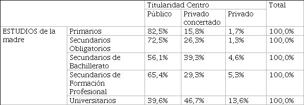 En la siguiente tabla, se observa la asociación entre nivel de estudios de las madres y el tipo de centro, lo que refleja una clara distribución del alumnado en los centros privados, privados concertados y públicos en función del origen social.