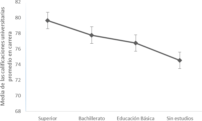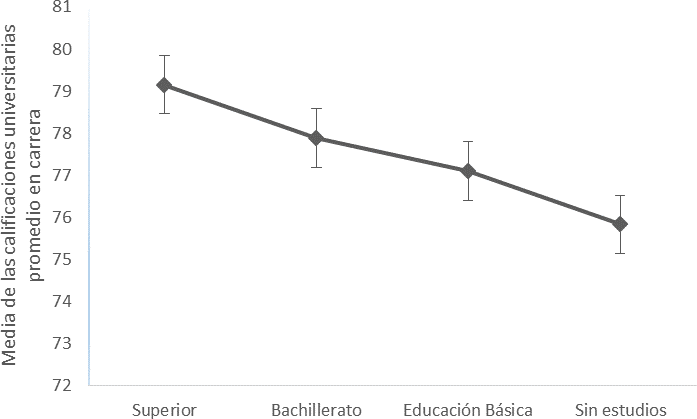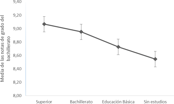 En cuanto al nivel educativo de ambos progenitores, se ratifican parcialmente los resultados encontrados previamente en la literatura (Garvanzo, 2007). Las gráficas tanto del nivel educativo de la madre como del padre dibujan, perfectamente, el efecto a través de las cuatro variables estudiadas (RA, rendimiento académico [calificaciones o notas] en el bachillerato, rendimiento académico [calificaciones o notas] en la prueba nacional de la SENESCYT y rendimiento académico [calificaciones o notas] disciplinar en la Universidad); la mayor formación de los padres es predictora del mayor desarrollo cognitivo (RA) y del mayor éxito académico en las distintas fases de la vida académica. En la literatura anterior sólo la formación de la madre se había desvelado como significativa.