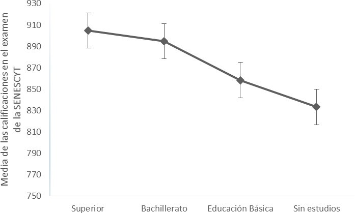 Existen diferencias significativas en el nivel de razonamiento abstracto, Z(586) = 23.23, p < .001, entre los estudiantes cuya madre tiene diferente nivel de formación. En este sentido, en orden descendiente, los estudiantes cuya madre tiene nivel Superior en educación tienen niveles más altos (M = 44.20, DE = 12.58) y los que menor nivel de razonamiento abstracto tienen son aquellos cuyas madre no han cursado algún tipo de estudio (M = 31.22, DE = 11.74; ver Figura 7). Asimismo, se presentan diferencias significativas en las notas de grado del bachillerato, Z(586) = 46.66, p < .001; en donde, los niveles más altos los presentan los estudiantes cuyas madres tienen formación de nivel Superior (M = 9.07, DE = 0.57) y los menores niveles los presentan los alumnos cuyas madres no tienen algún tipo de estudios (M = 8.54, DE = 0.39; ver Figura 8). De igual manera, en las calificaciones en el examen de la SENESCYT, las diferencias son significativas, Z(586) = 45.04, p < .001; de la misma forma, los alumnos cuyas madres tienen educación de nivel Superior presentan mayores niveles (M = 904.75, DE = 61.57) que los alumnos cuyas madres no tienen algún tipo de estudio (M = 833.28, DE = 78.97; ver Figura 9). En cuanto a las calificaciones universitarias, existe el mismo patrón, diferencias significativas, F(586) = 340.1, p < .001, en donde los alumnos cuyas madres tienen educación de nivel Superior tienen las mayores puntuaciones (M = 79.63, DE = 6.48) y los alumnos cuyas madres no tienen algún tipo de estudios muestran los niveles más bajos (M = 74.53, DE = 5.17; ver Figura 10).