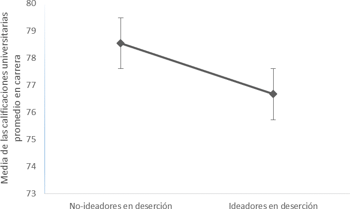 En el nivel de razonamiento abstracto no se muestran diferencias significativas, U(198, 388) = 35502.50,p=.133,entrelaspersonasquehanpensadoenabandonaralgunavezlacarreraono.Deigualmanera,enla nota de grado del bachillerato no se muestran diferencias significativas U(198, 388) = 38294, p = .951.Asimismo,enlacalificaciónenelexamendelaSENESCYTnoexistendiferenciassignificativasU(198,388) = 35693, p = .161. No obstante, en las calificaciones universitarias promedio en carrera sí existen diferenciassignificativas,t(198,388)=3.62,p<.001,d=0.28(TE:pequeño);losestudiantesquenohanpensadoenabandonar la carrera tienen puntuaciones promedio significativamente más altas (M = 78.54, DE = 5.84)quelosquehanpensadohacerlo(M=76.66,DE=6.11;verFigura15).
