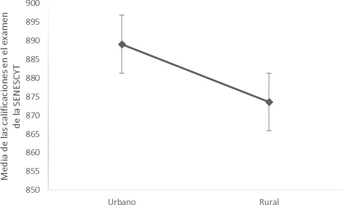 Existen diferencias significativas en razonamiento abstracto, U(390, 196) = 34083, p < .033, g = 0.19, si comparamos la zona urbana, que tiene mayores puntuaciones en esta variable (M = 42.12, DE = 13.42), con respecto a la zona rural (M = 39.55, DE = 13.73; ver Figura 4). Del mismo modo, las notas de grado del bachillerato evidencian diferencias significativas, U(390, 196) = 33511.5, p < .016, g = 0.21 (TE: pequeño); la zona urbana posee una media más elevada (M = 8.94, DE = 0.59) que la zona rural (M = 8.82, DE = 0.52; ver Figura 5). También, en las calificaciones del examen de la SENESCYT, las diferencias son significativas, U(390, 196) = 33592, p < .018, g = 0.21 (TE: pequeño); siendo la zona urbana igualmente la que muestra puntuaciones como media más elevadas (M = 889.07, DE = 73.69) que la zona rural (M = 873.58, DE = 76.25; ver Figura 6). En contraposición, las calificaciones universitarias promedio en carrera no reportan diferencias significativas, t(390, 196) = 1.49, p = .136; lo que significa que, una vez en el sistema universitario y, ante los mismos medios, las diferencias anteriormente mostradas en periodos académicos anteriores, desaparecen.