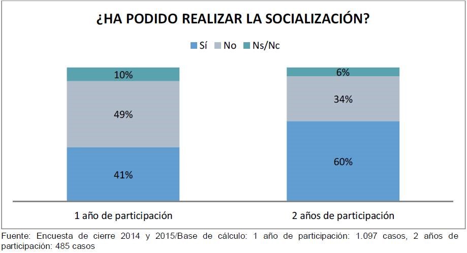 Este bajo nivel de concreción de las instancias de socialización también quedó plasmado en distintos informes anuales del plan en la provincia de Buenos Aires. Allí se señala, por ejemplo, que en 2014 la socialización sólo pudo ser concretada por pocos docentes, con la presencia en cada agrupamiento de un núcleo de cuatro o cinco profesores que pudieron implementar la actividad (Informe 2-2014). Durante 2015 esta preocupación también aparece presente al identificar la escasa profundización que se pudo lograr en el diseño de las propuestas de socialización con los docentes (Informe 3-2015).