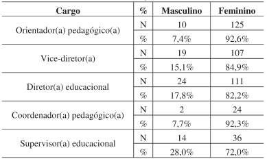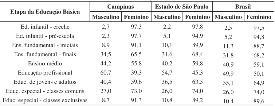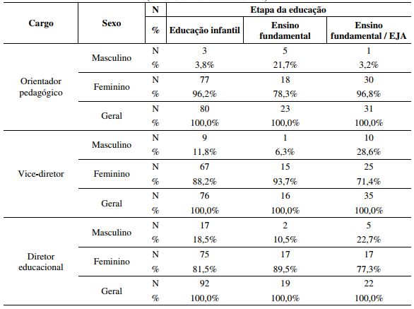 A desigualdade de gênero na docência nas diferentes etapas da educação brasileira tem sido problematizada pela produção acadêmica da área (Saparolli, 1998; Vianna, 2001/02) e contribuímos com tal discussão evidenciando também as desigualdades entre os cargos de especialistas em educação – diretor(a) educacional, vice-diretor(a), orientador(a) pedagógico(a) –, constatando que a falta de interesse de homens por atuar na docência em determinadas etapas não reflete, necessariamente, a mesma situação ao considerarmos a ocupação de cargos na gestão escolar no mesmo segmento de ensino.