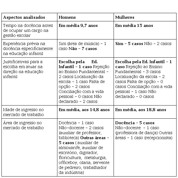 A pesquisa mostra diferenças percebidas entre eles e elas no tempo de carreira docente até a ascensão a um cargo na gestão escolar, a quase ausência de experiência prévia específica na educação infantil pelos homens e a atuação como diretor mais pela escolha do cargo do que pela educação infantil. Tais aspectos revelam um perfil que, de antemão, apresentava pouco comprometimento com as lutas históricas cravadas pela educação infantil e suas profissionais.