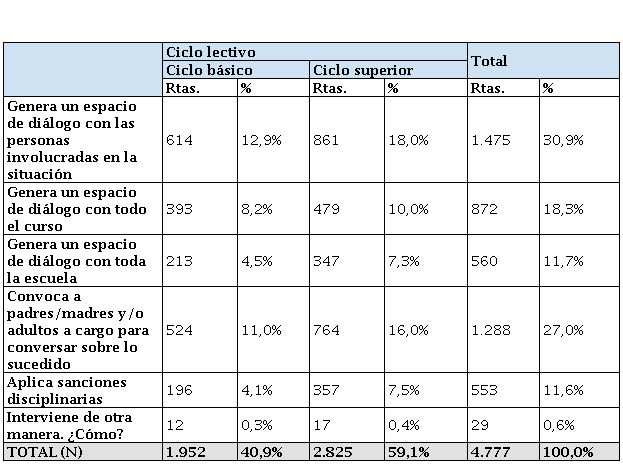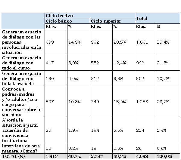Como muestran los números precedentes, al referirse a los modos de intervención de la escuela ante situaciones de violencia tanto física (Tabla 8) como ante otro tipo de situaciones de violencia (Tabla 9), el orden de las opciones elegidas se mantiene constante al comparar los totales y cada uno de los ciclos. En todos los casos, aunque con algunas leves diferencias en los porcentajes, asoma en primer lugar la generación de un espacio de diálogo con las personas involucradas en la situación, seguida por convocar a padres/madres o adulto a cargo, luego por una conversación con todo el curso y finalmente con toda la escuela.