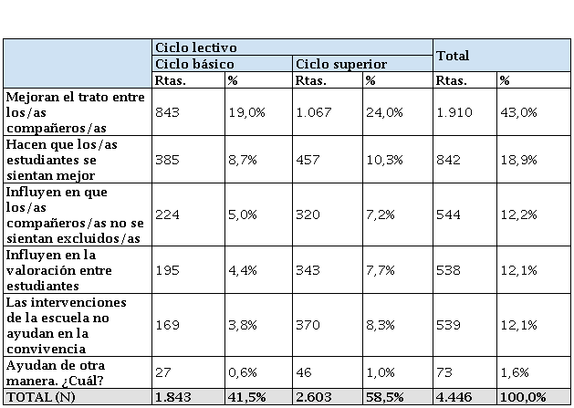 Al preguntar en qué ayudan las intervenciones escolares en la convivencia, es posible observar una notoria diferencia en las respuestas de ambos ciclos. Más allá de que haya una coincidencia en las dos opciones elegidas con mayor frecuencia (“Mejoran el trato entre compañeros/as” y “Hacen que los/as estudiantes se sientan mejor”), se perciben discrepancias del tercer lugar en adelante. La más significativa se presenta ante la opción que sostiene que las intervenciones de la escuela no ayudan a la convivencia, la cual en el ciclo básico ocupa el quinto lugar (representando menos del 10% del total de respuestas del ciclo), pero que se ubica tercera en el ciclo superior (representando algo más del 15% del total de respuestas del ciclo).