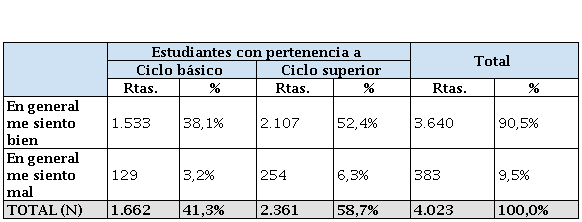 Como puede apreciarse en la Tabla 1, con 1.533 sobre un total de 1.662 respuestas en el ciclo básico y 2.107 sobre un total de 2.361 respuestas en el superior, las y los jóvenes de ambos ciclos afirman que se sienten bien en la escuela. Este resulta un punto de partida fundamental para acercarnos a una comprensión de las percepciones y vivencias en torno a la comunicación de las emociones y los modos de intervención institucional ante situaciones de violencia. La escuela representa, en primera instancia, un espacio en el cual sentirse a gusto, lo que abre a la posibilidad de mostrarse quizás más permeables a las propuestas tendientes a abordar las emotividades y conflictos por parte de los profesionales de cada institución.