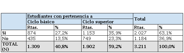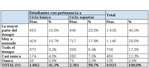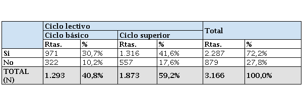 Para dar mayor especificidad al perfil de estudiantes que han respondido la encuesta, es posible mencionar que 1667 se identifican con el género masculino, 2299 con el género femenino y 57 con otros géneros. A la vez, 1878 afirman tener entre 13 y 15 años; 1926 entre 16 y 18 años y 219, 19 años o más. Finalmente, en relación con el ciclo de formación que se encuentran cursando, 1662 afirman estar en el ciclo básico (1, 2 o 3 año) y 2361 se ubican en el ciclo superior (4, 5 y 6 año o 7 año de escuela técnica). Esta última distinción reviste especial importancia por el objeto de estudio de este artículo.