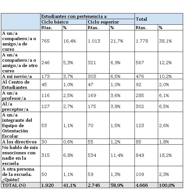 En cuanto a quiénes son registrados como los principales interlocutores para conversar sobre las emociones en la escuela (Tabla 4), es posible separar las respuestas en función de aquellas opciones que incluyan a un par generacional y las que remiten a los referentes adultos. De este modo, el conjunto que representa a las y los compañeros/as, parejas y el Centro de Estudiantes, es el más seleccionado por las y los jóvenes de ambos ciclos, marcando una coincidencia con respecto a quienes son más elegidos como referentes para conversar sobre las emociones.