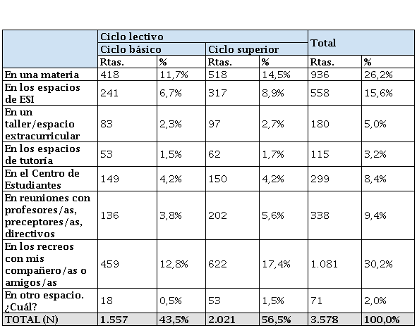 La primera diferencia entre ciclos la hallamos recién en el siguiente puesto en cuanto a la frecuencia. Para el superior, la opción que se ubica en el cuarto lugar es “En reuniones con profesores/as, preceptores/as, directivos”, mientras que en el básico lo hace “En el centro de estudiantes”. Más allá de esta diferencia, vale la pena detenerse en la respuesta sobre el centro de estudiantes dado que representa otra instancia de diálogo con pares generacionales. Sin embargo, resulta preciso hacer la salvedad de que no todas las escuelas que formaron parte de la muestra contaban al momento de la toma del instrumento con un centro de estudiantes activo, lo cual repercute en que el caudal de respuestas pueda ser menor.
