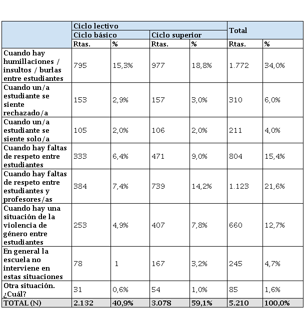 En la Tabla 7, más allá de haber similitudes en las opciones seleccionadas con mayor frecuencia en cada uno de los ciclos, resulta interesante hacer foco en quienes plantean que en general la escuela no interviene ante este tipo de situaciones. Aquí puede observarse que, si bien es leve la diferencia y baja la cantidad de estudiantes que optaron por esta respuesta, la misma representa el 3,56% del total en el ciclo básico (78 de 2132), mientras que para el ciclo superior es del 5,4% (167 de 3078). Aquí también surge una tendencia hacia el no reconocimiento de la acción de la escuela ante otras situaciones de violencia en la medida en que las y los jóvenes avanzan en su escolaridad, como pasaba al analizar la pregunta sobre la intervención escolar frente a la violencia física (Tabla 6).