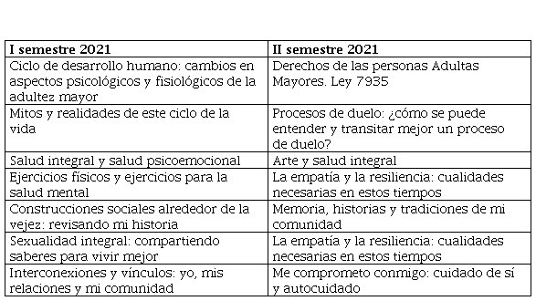 El artículo tiene como objetivo reflexionar sobre los logros y retos de los espacios virtuales de acompañamiento psicosocial con personas adultas mayores en tiempos de pandemia, a partir de la experiencia de los años 2020 y 2021 con dos grupos comunitarios.