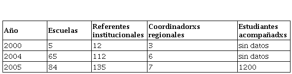 Como se menciona en este relato, este pasaje implicó, por un lado, “un abismo en dimensiones” ya que se incrementó exponencialmente la cantidad de escuelas con las cuales se trabajaba, y por otro, “una forma desigual en relación a la intervención en las distintas regiones”. Según los datos proporcionados por el Programa, en el año 2000 eran 5 escuelas, 12 referentes institucionales y 3 coordinadorxs regionales. En el año 2004, eran 65 escuelas, 112 referentes institucionales y 6 coordinadorxs regionales; y para el año 2005, se incrementaron a 84 escuelas, 135 referentes institucionales, 7 coordinadorxs regionales y se registraron 1200 estudiantes embarazadas, madres y padres que se acompañaron.