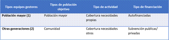 Así, se ha detectado que cuando el equipo gestor es población mayor, la población objetivo puede variar tanto en población mayor como en la comunidad, el tipo de actividad también puede incluir la cobertura de necesidad propias o de terceros y los tipos de financiación se vinculan a la subvención, cuanto cubren necesidades de otros, y a la autofinanciación cuando las necesidades son propias.