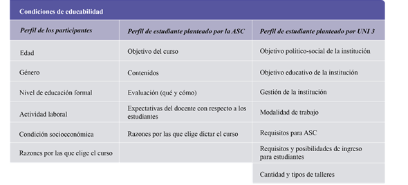 Considerando los aportes de López y Tedesco (2002), se define por condiciones de educabilidad al conjunto de recursos a los que accede una persona mayor para formar parte exitosamente de una práctica educativa. Por una parte, están los recursos a los que accede la persona a través de su experiencia de vida y, por la otra, los recursos que se le brinda, en este caso, desde UNI 3 y, más precisamente, desde el taller Filosofía para la vida: aportes de oriente y occidente. Nos referimos que participar exitosamente de una práctica educativa bajo estas circunstancias, implica que la persona se sienta parte de ese espacio, quiera estar allí porque lo que sucede le conmueve y aporta a su calidad de vida.