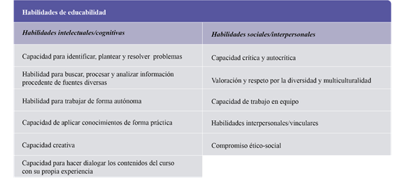 Por su parte, las habilidades para la educabilidad contemplan las habilidades sociales y afectivas y las habilidades intelectuales o cognitivas. Por habilidades sociales se entiende a las “conductas aprendidas mediante las cuáles expresamos ideas, sentimientos, opiniones, afecto, mantenemos o mejoramos nuestra relación con los demás y resolvemos y reforzamos una situación social” (León, 2009, p. 67). Por habilidades cognitivas o intelectuales se entienden aquellos procesos y capacidades necesarias en el ser humano para llevar a cabo una tarea. Además, estas habilidades son facilitadoras del conocimiento ya que se encargan de adquirirlo y retomarlo para ser utilizado posteriormente (Ramos et al., 2010).