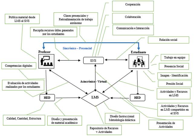 El modelo planteado permite al estudiante tener la oportunidad de acceder a todas las actividades y recursos a través del LMS, que actúa como el eje central dentro del modelo educativo. Este LMS se vincula principalmente con las Redes Sociales de acceso libre y los Entornos Digitales de Aprendizaje (HED), con el propósito de ofrecer una alternativa de educación híbrida. Esta modalidad, conocida como bLearning, combina tanto el aprendizaje sincrónico como el asincrónico en una modalidad mixta. De esta manera, el estudiante puede acceder a la plataforma social de forma virtual y ubicua, mientras que las actividades presenciales se llevan a cabo en la institución educativa.
