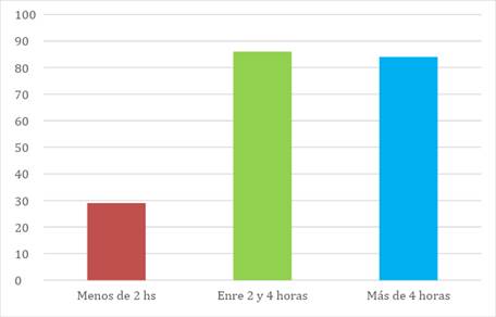 Las horas dedicadas al estudio de la asignatura son variables entre subgrupos. Alrededor de ⅖ (n=84) estudian más de 4 hs., otros ⅖ (n=86) entre 2 y 4 hs. y la fracción restante menos de 2 hs. (Figura 4).
