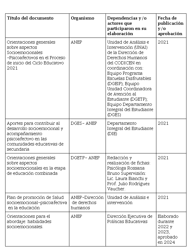 Administración Nacional de Educación Pública (2024). Orientaciones para el abordaje: habilidades socioemocionales. Recuperado de: https://transformacioneducativa.anep.edu.uy/sites/default/files/images/componentes/Curricular/orientaciones/Orientaciones%20-%20Habilidades%20socioemocionales%202024v.pdf