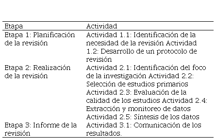 La presente RS incluyó para su desarrollo las orientaciones establecidas por Kitchenham (2004), ampliamente utilizada en las ciencias sociales, véase Tabla 1.