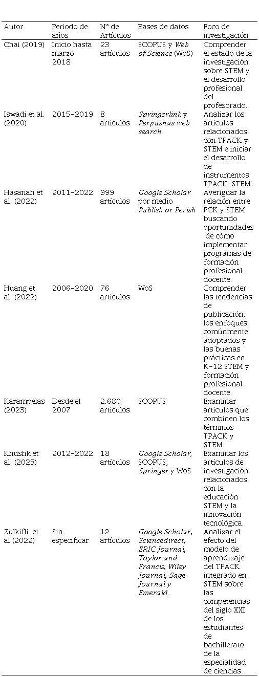 En la Tabla 2, se observa que las RS y bibliometrías centradas en TPACK y el enfoque STEM incluyen preferentemente elementos de la formación profesional docente. Las RS se desarrollan desde el año 2020, incluyendo artículos desde el inicio del TPACK. Se abordaron entre ocho y 2.680 artículos, siendo Google Scholar, SCOPUS y WoS, las bases de datos predilectas.