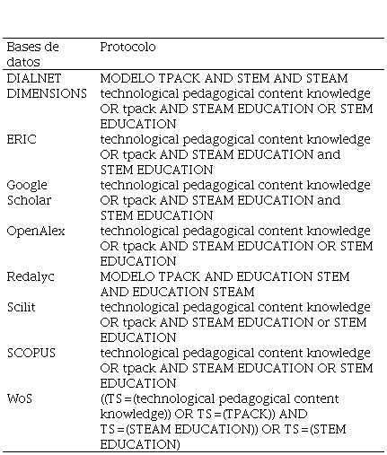 Seguidamente se realizó una RS analizando documentos del TPACK y los enfoques STEM y STEAM, desde el inicio del modelo TPACK hasta marzo 2024. Las ecuaciones de búsqueda se construyeron considerando el término TPACK para evitar enfocar solo en uno o dos conocimientos (Mishra y Koehler, 2006; De Rossi y Trevisan, 2018).