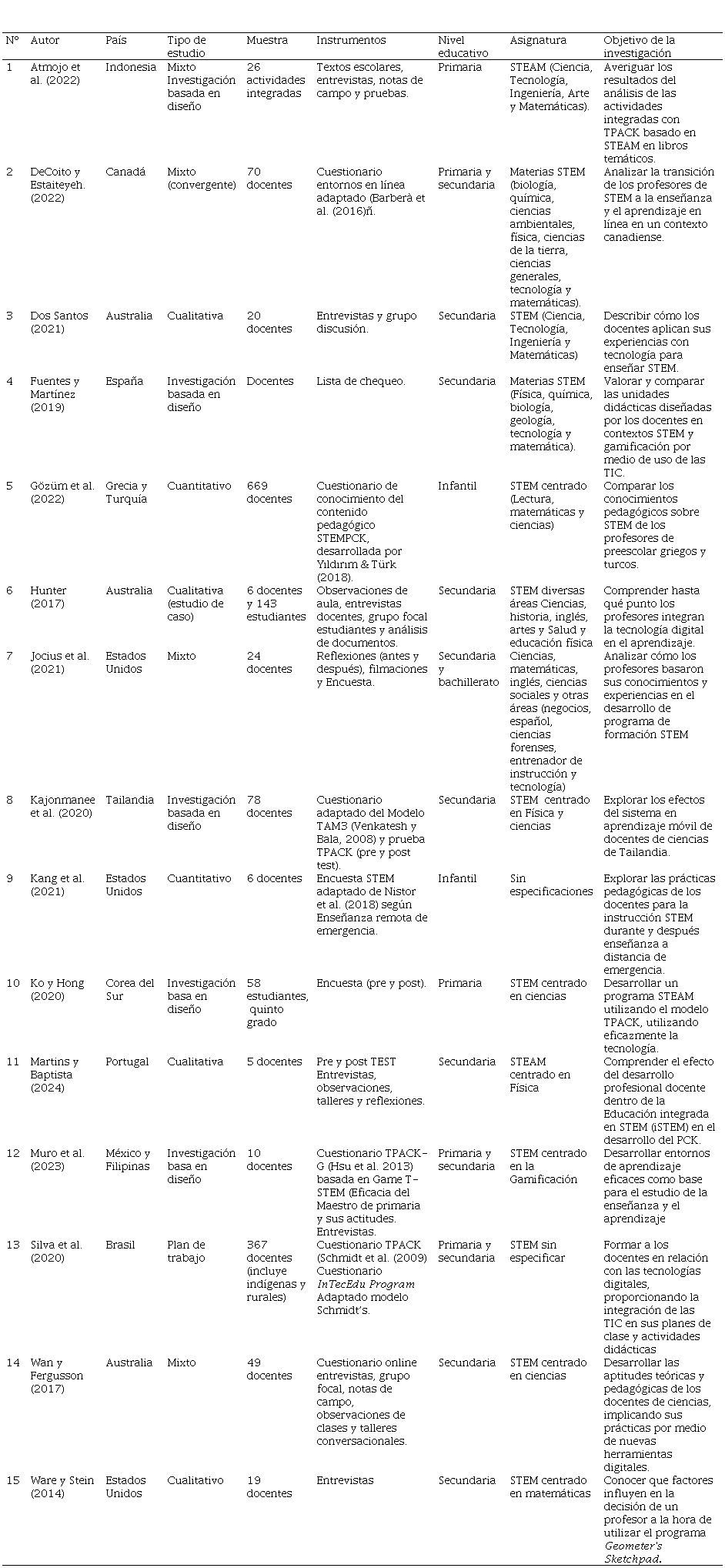 En la Tabla 5se observa que un tercio de los estudios se relaciona con el autoinforme de conocimientos. Las investigaciones se desarrollan en América, Asia y Europa, la mitad son estudios mixtos, seguidos por cuantitativo y basado en diseño. La muestra más significativa corresponde a Gözüm et al. (2022) con 669 docentes de infantil, por su parte, la muestra más acotada es Jocius et al. (2021) con 24 docentes de secundaria y bachillerato. En relación con los instrumentos, se utiliza con mayor frecuencia el cuestionario entre ellos, entornos en línea adaptado (Barberà et al., 2016), STEMPCK (Yıldırım y Türk 2018) y el Modelo TAM3 (Venkatesh y Bala, 2008). Las investigaciones se realizan entre los niveles infantil y bachillerato, siendo secundaria el nivel más demandado. Con respecto al enfoque, la mitad de los estudios incluyeron todas las signaturas STEM, mientras que los otros estudios se centraron solo en dos asignaturas, entre ciencias, física y matemática.