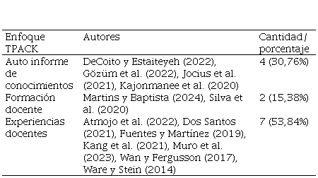 Se observa una diversificación de instrumentos, obteniendo un panorama más objetivo en las investigaciones del TPACK, destacando los espacios de reflexión por medio de talleres. Según Ballesta et al. (2017), Maboe et al. (2018) y Schmid et al. (2024) el desarrollo de investigación TPACK requiere de contextos amplios con muestras heterogéneas, incluyendo los diversos integrantes de la comunidad educativa e instrumentos de investigación de diferentes índoles.
