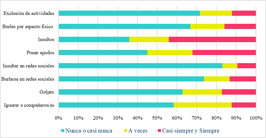 En cuanto a las formas específicas de violencia, las agresiones verbales, como burlas e insultos, prevalecen con mayor frecuencia, seguidas de la resolución de problemas a golpes. Estos resultados corroboran investigaciones previas que subrayan que las agresiones verbales y físicas son comunes en contextos escolares debido a dinámicas normalizadas de resolución de conflictos (Domínguez-Rodríguez, Deaño y Tellado, 2020; Chávez, 2023). Cabe destacar que los insultos en redes sociales o amenazas tienen menor incidencia, lo que podría indicar una migración parcial de las agresiones a plataformas digitales (Romero y Prieto, 2021).