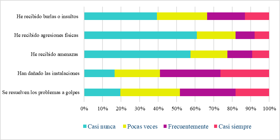 Las agresiones que se presentan con mayor frecuencia son haber recibido burlas o insultos de forma frecuente o casi siempre (33%). También, las respuestas de 46% de los participantes indican que sus compañeros resuelven los problemas a golpes de manera frecuente o casi siempre. Las agresiones físicas y amenaza ocurren con menor frecuencia; no obstante, 17% y 21.6% respectivamente, refieren recibir este tipo de agresiones de forma frecuente o casi siempre (ver Figura 2).