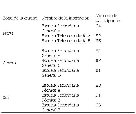 Las instituciones de educación secundaria fueron seleccionadas en función de su ubicación en las zonas de mayor incidencia delictiva de acuerdo con el diagnóstico por colonia que genera la Secretaría de Seguridad Ciudadana del Estado (Gobierno del Estado de Baja California, 2023). Con base en estos datos, se realizó un muestreo por estratos, seleccionado escuelas secundarias que se encontraban en una de las cinco zonas de mayor incidencia delictiva de la ciudad (ver Tabla 1). Con el fin de resguardar la información de las instituciones educativas que participaron en el estudio, se les asignó un nombre genérico y solo se mantuvo la tipología a la que pertenecen.