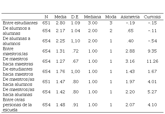 Se presentan los estadísticos descriptivos de las diversas dimensiones que componen los instrumentos aplicados. Inicialmente se describe los estadísticos de tendencia central de los indicadores de violencia entre los actores que integran la institución. La relación entre estudiantes es el indicador de violencia que presenta la media más alta (x̅= 2.80, d.e. = 1.09) del instrumento, seguida por el de relación entre alumnas y alumnos (x̅= 2.17, d.e. = 1.04). En contraste, los indicadores que presentan las medias más bajas son violencia entre los maestros (x̅=1.31, d.e. =.72) y de maestros hacia maestras (x̅=1.27, d.e. =.67) (ver Tabla 2).