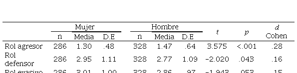 Posteriormente, se analizaron los roles de los participantes en los eventos de violencia que ocurren en las instituciones. De acuerdo con los datos, el rol evasivo (x̅=2.93, d.e. =.98) y el rol defensor (x̅= 2.86, d.e. =1.10) son las dimensiones que presenta la media más alta de las escalas; mientras que el rol agresor es la que presenta la media más baja (x̅=1.40, d.e. =.52). Dado que las respuestas presentan una distribución normal, se realizó un análisis t de student para comparar la participación en los eventos de violencia entre hombre y mujeres. Se muestran diferencias estadísticamente significativas entre los grupos para el rol agresor y rol defensor con tamaños del efecto de pequeños (ver Tabla 3).