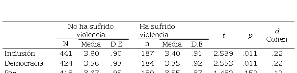 También, se realizó un análisis t de student para comprar la perspectiva entre estudiantes que han sufrido violencia y quiénes no, sobre las dimensiones de la escala de convivencia escolar (ver Tabla 4). Se identifican diferencias estadísticamente significativas para la dimensión de inclusión y democracia con tamaños del efecto de pequeños.