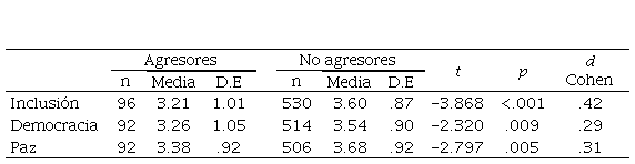 Se llevó a cabo el análisis tde student para comprar la perspectiva entre estudiantes que han sido agresores y estudiantes que no han sido agresores sobre las dimensiones de convivencia escolar. Se describen diferencias estadísticamente significativas para las dimensiones de inclusión, democracia y paz, con tamaños del efecto de pequeños a medianos (ver Tabla 5).