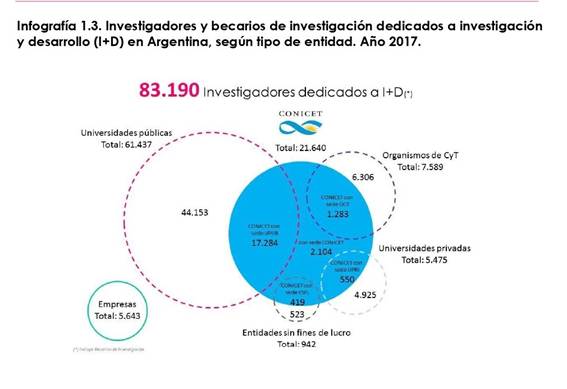 Como vemos en la siguiente infografía, en 2017 el número total de investigadores y becarios ascendía a 83.190 de los cuales 44.153 están en las Universidades Nacionales, 7.589 en Organismos de CyT, 5.475 en Universidades Privadas, 942 en Entidades sin fines de lucro y 5.643 en Empresas. A su vez, los investigadores y becarios del CONICET se insertan en estos sectores, aunque predominan en las Universidades Públicas donde desarrollan actividades científicas, 17.284 del total de 21.640.