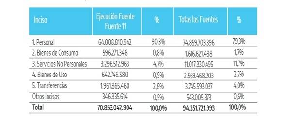 Ahora bien, si nos focalizamos en las Universidades Nacionales observamos que en 2017 el número de docentes universitarios ascendía a 189.218 sobre los cuales descansan las distintas funciones de enseñanza (grado y posgrado), extensión, gestión e investigación. Sin embargo, cuando analizamos la composición de la ejecución presupuestaria, también para el mismo año 2017, vemos que prácticamente el 80 % de los recursos se destina a salarios del personal docente y no docente como muestra el cuadro de abajo.