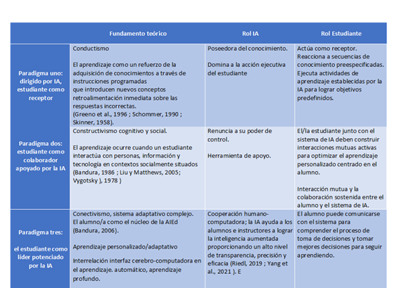 La docencia, en cualquiera de sus etapas profesionales, tiene asumidos posicionamientos en relación a las teorías del aprendizaje, al modo de enseñar y al lugar posible de la IA Generativa. Para ilustrar este argumento, el trabajo del equipo de investigadores chinos, Fan Ouyang y Pengcheng Jiao (2021), organizan tres paradigmas posibles de vinculación de la IA: