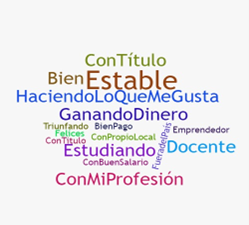 Entre las respuestas que observamos como recurrentes destacamos aquellas donde el futuro laboral es imaginado como un estar “bien”, “con un buen salario”, “trabajando en lo que me gusta”, “con un trabajo estable”, “ejerciendo mi profesión”, “trabajando fuera del país” y “trabajando para una empresa del exterior”, “trabajando de docente”, “a cargo de mi propio local” o “emprendimiento”, etc. En términos generales, las respuestas positivas acerca de cómo se imaginan el futuro laboral aparecen de forma mayoritaria (85%) entre los 429 estudiantes encuestados.